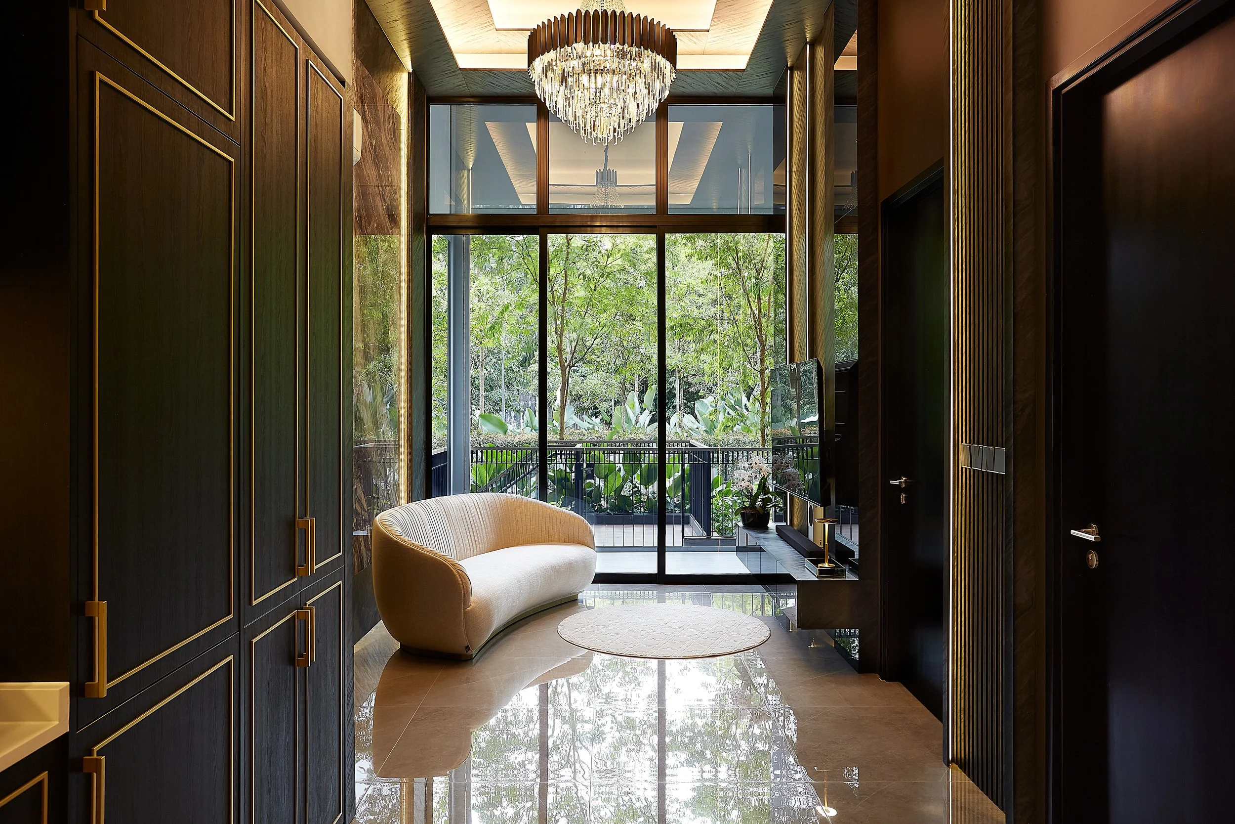 A study in contrast — bold yet calm, opulent yet inviting — setting the tone for a home that feels both striking and serenely composed