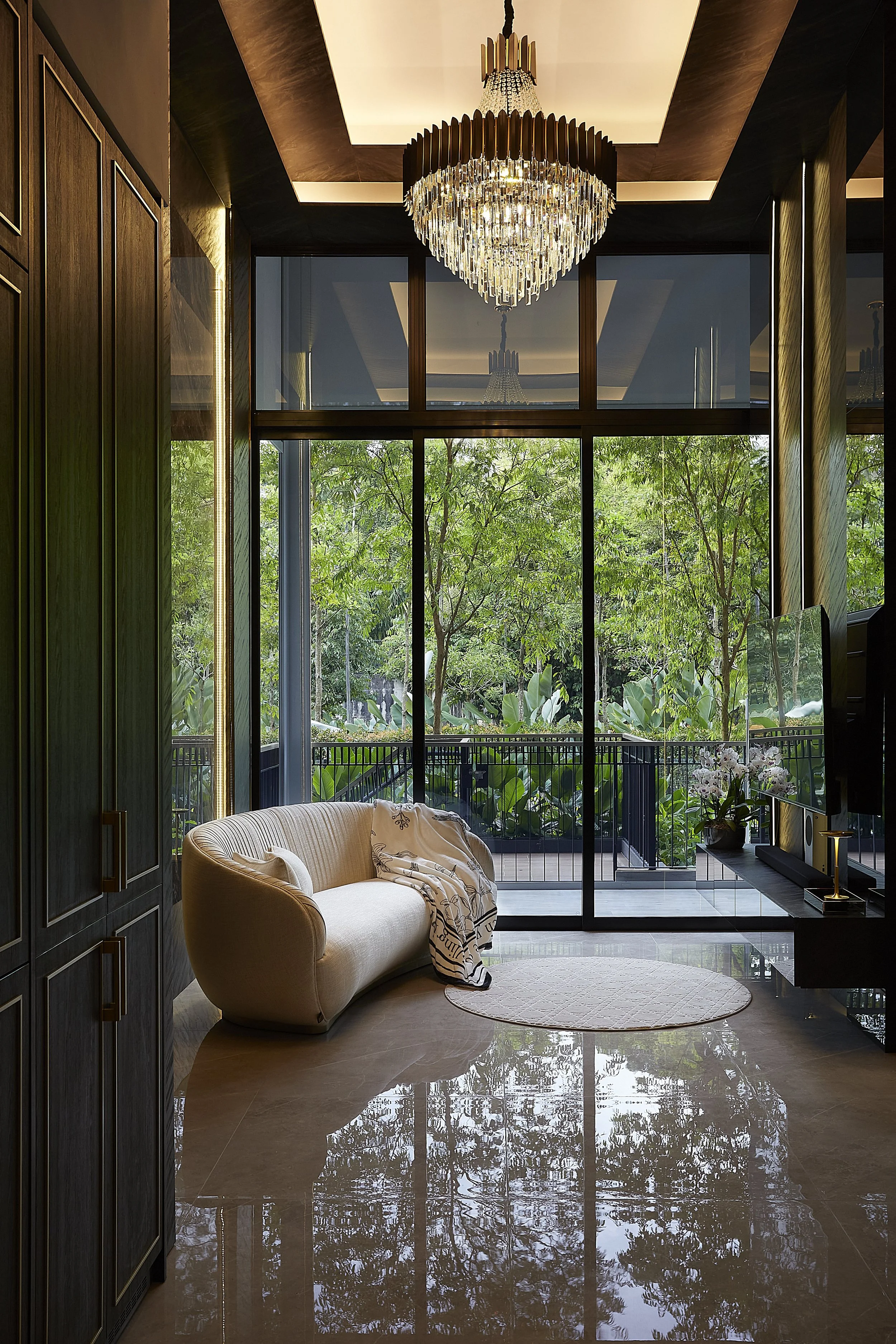 Gracefully contoured and timeless in tone, this feature embodies understated opulence through form, light, and material.